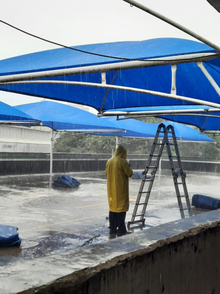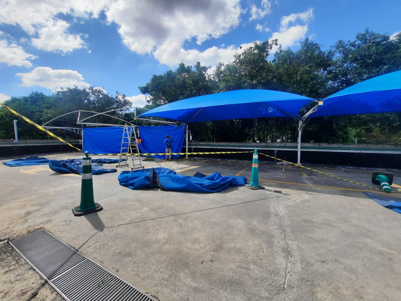 Após nossa visita técnica, identificamos a necessidade de substituir as capas antigas por novas para garantir mais durabilidade e manter o padrão estético. Nesse projeto, realizamos a troca de 15 capas, utilizando polietileno de alta densidade (220gr/m²) na cor azul permeável, reconhecido pela resistência e excelente desempenho.