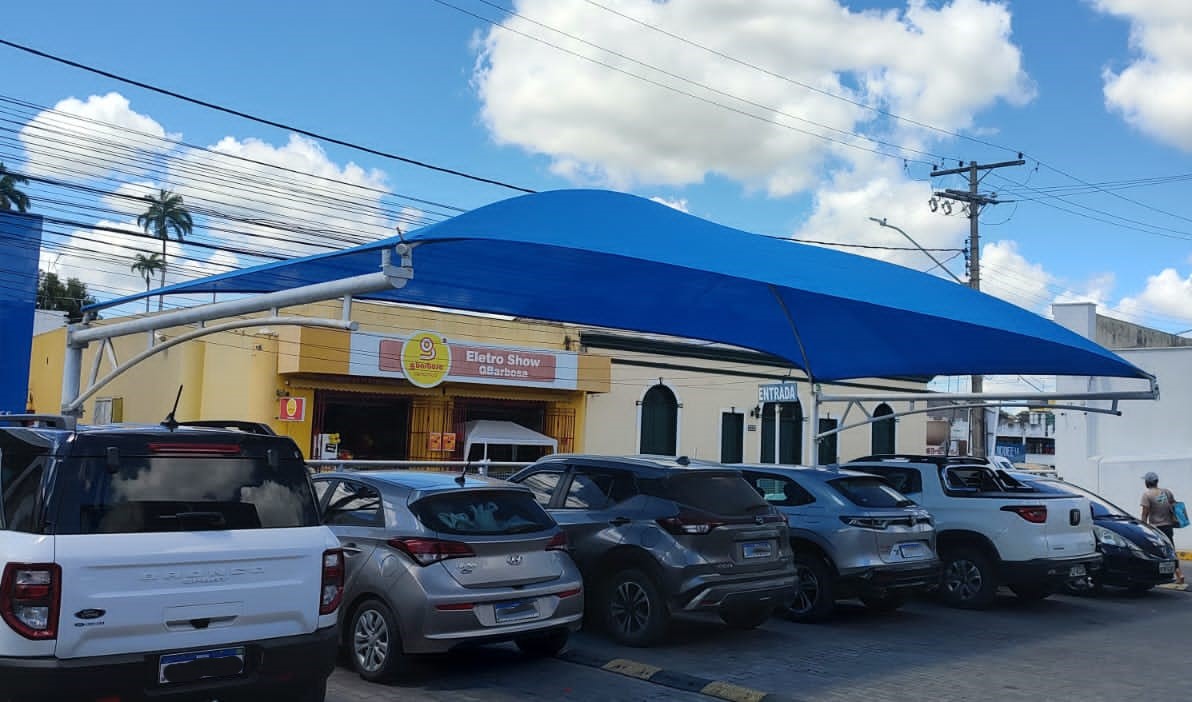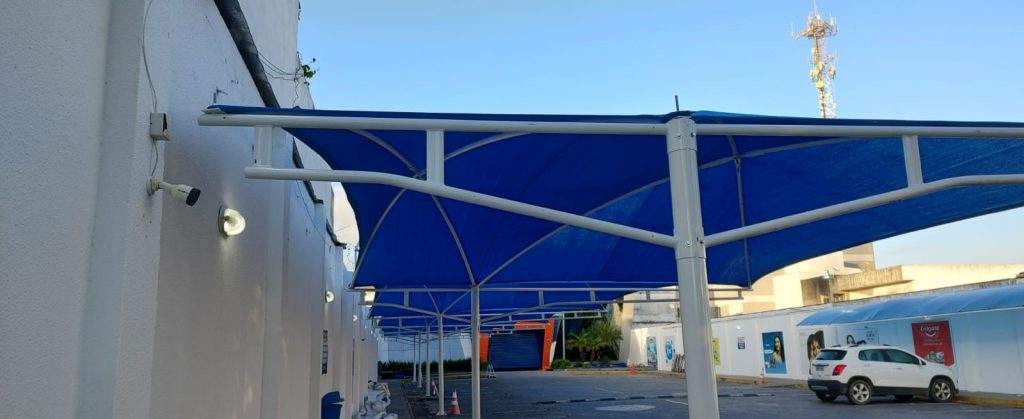 O desafio foi criar um sombreamento eficiente para a área externa, composto por 10 módulos sombreadores Tecno Sombra® com tela de polietileno de alta densidade (220gr/m²) na cor azul permeável, cada um medindo 2,10 m de largura, complementando a cobertura para veículos. A estrutura foi sustentada por pilares TS® balanço duplo de 2,50 m de altura.